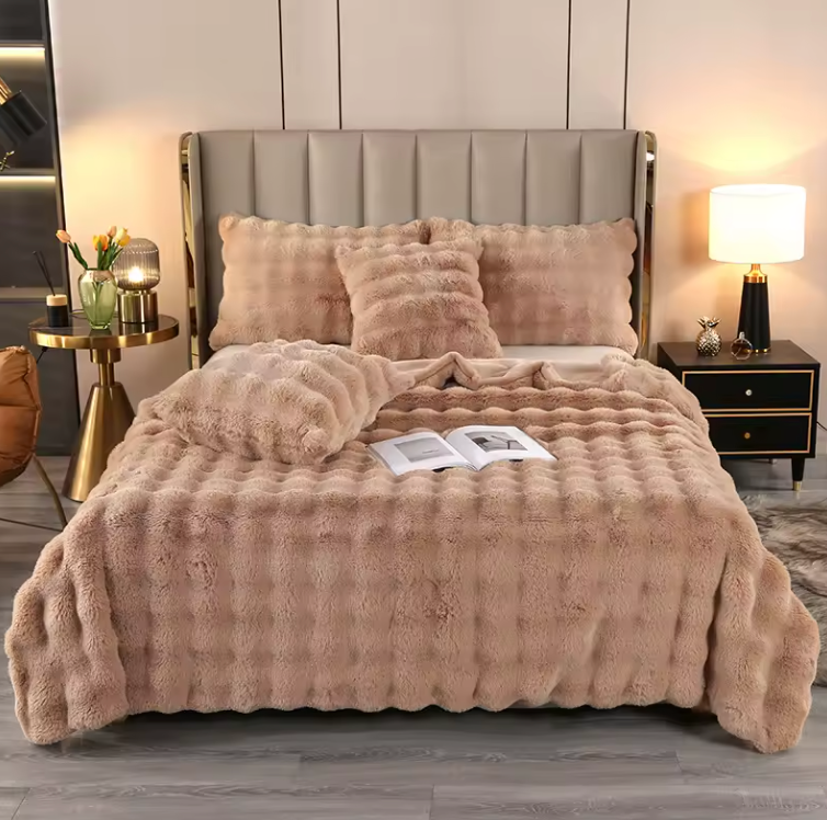 Entworfen, um Sie mit außergewöhnlicher Wärme und Komfort zu umhüllen. Die samtige Weichheit des Kunstpelzes schafft eine gemütliche und raffinierte Wirkung, ideal, um jedem Schlafzimmer Charme zu verleihen.